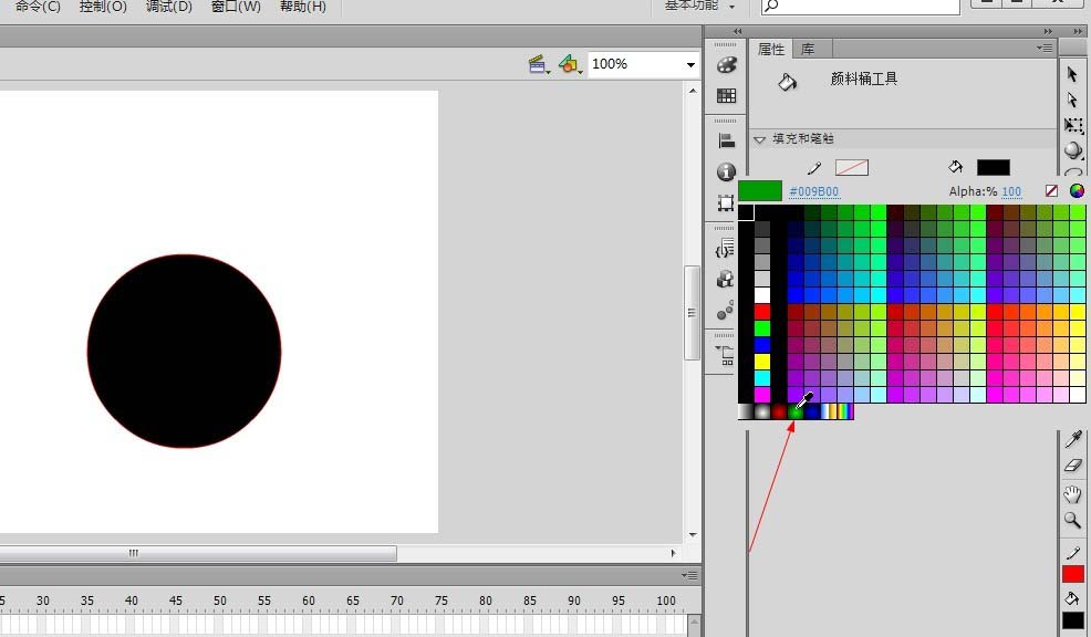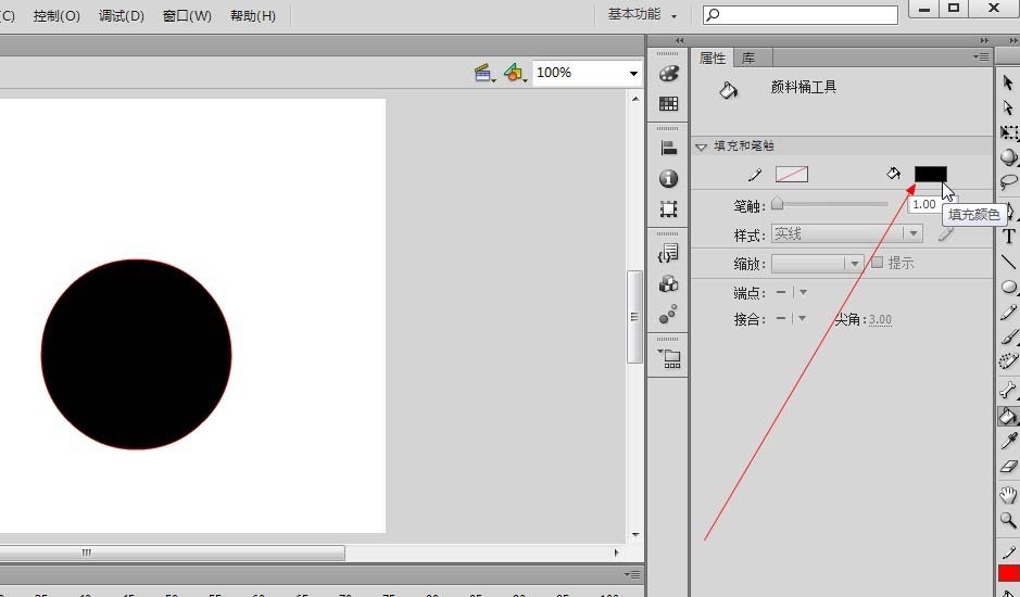 4、如圖所示,在顏料桶工具屬性那里,我們單擊箭頭所指的顏料桶那里,來選擇一個填充色。