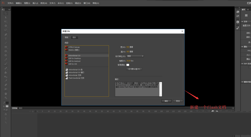 1、在flash文件菜單欄中執行新建文檔命令,彈出新建文檔對話框,在新建文檔中設置相關屬性并創建文檔。