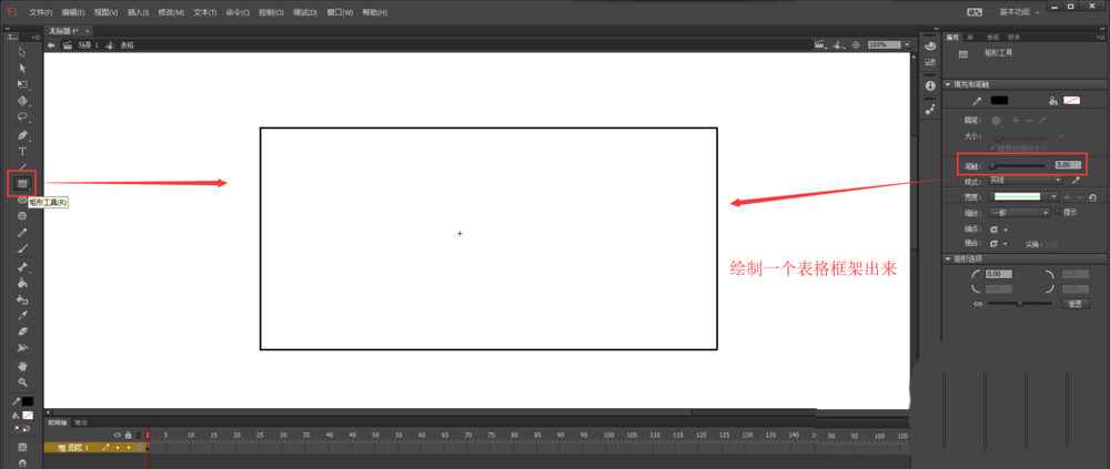 4、在屬性中設置描邊的大小為3像素,然后在編輯區域拖動鼠標進行繪制,繪制出一個矩形出來。
