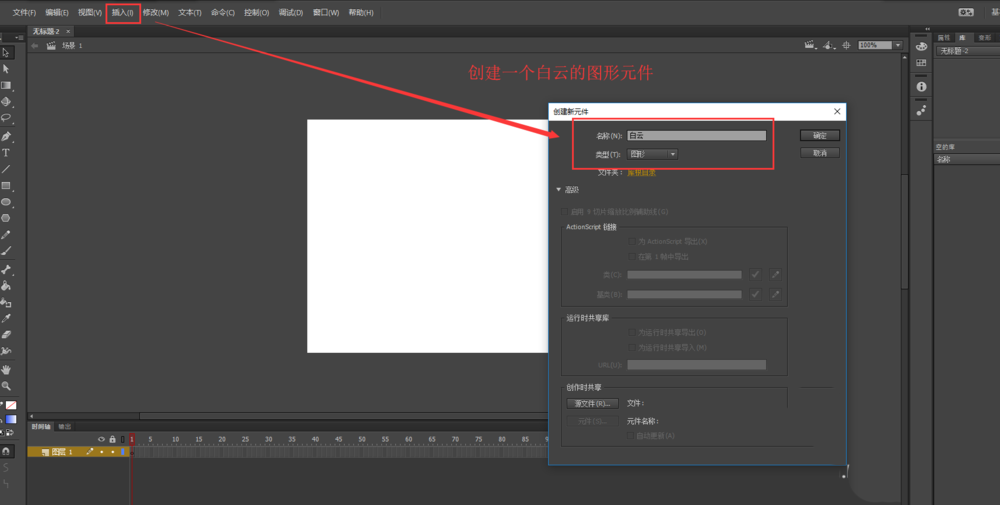 1、在flash文檔中,選擇插入中的新建元件命令,在彈出的創建新元件對話框中輸入元件名稱“白云”,選擇類型為圖形元件,點擊創建。