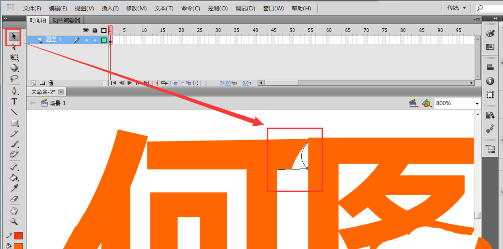 4、按Ctrl+加號放大場景舞臺,使用“選擇工具”拖動文本的筆畫,改變其形狀,將文字與文字之間連接起來。