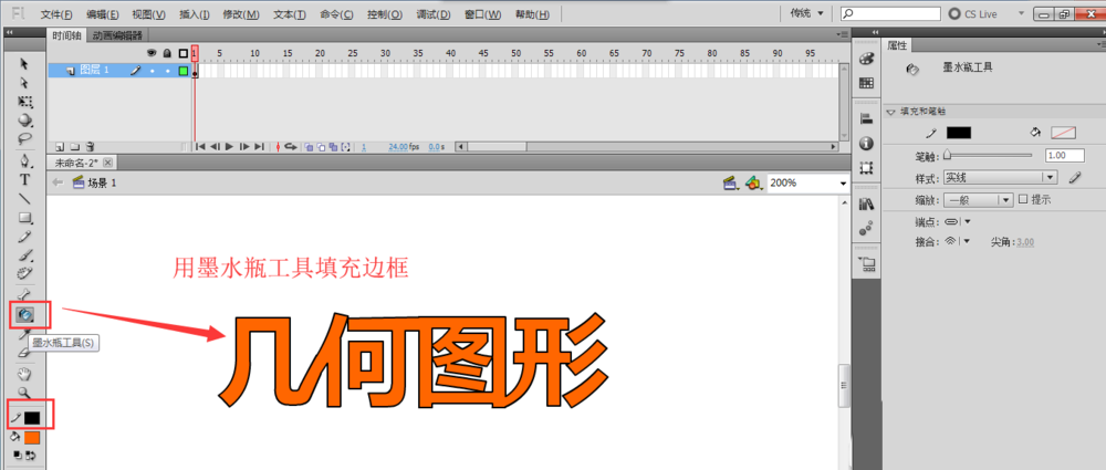 5、找到并選中“墨水瓶工具”,設置筆觸顏色為黑色的實線,然后鼠標單擊給文字添加邊框的框線。