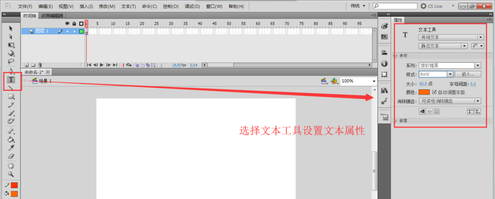 1、選擇“文本工具”,然后在“屬性”窗口面板中設置文本的屬性,如文本的大小,字體顏色、字體等。
