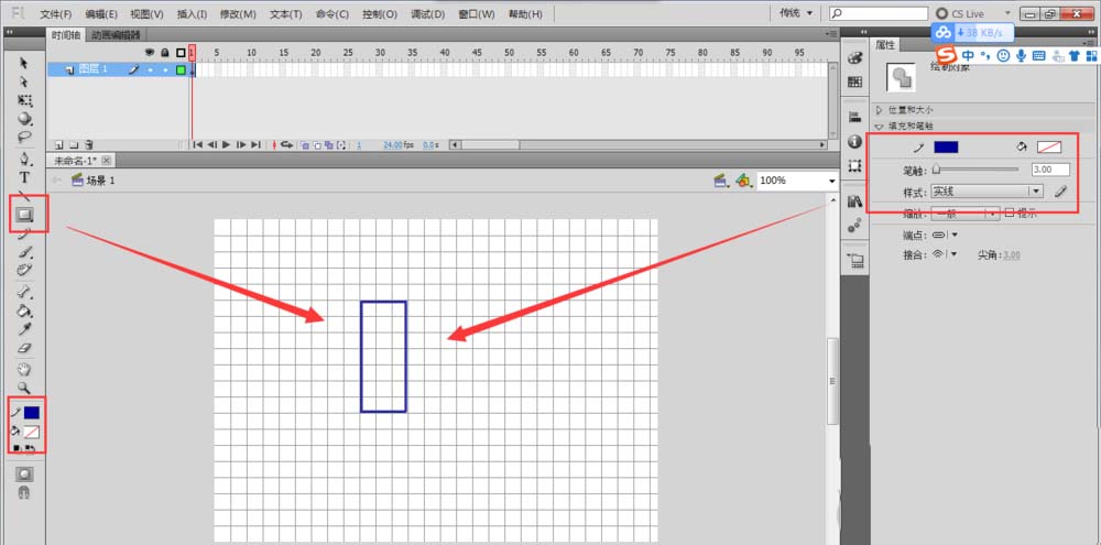 4、設置填充顏色為無填充,然后選擇矩形工具,用矩形工具在舞臺中以網格線為基準繪制一個矩形圖形出來。