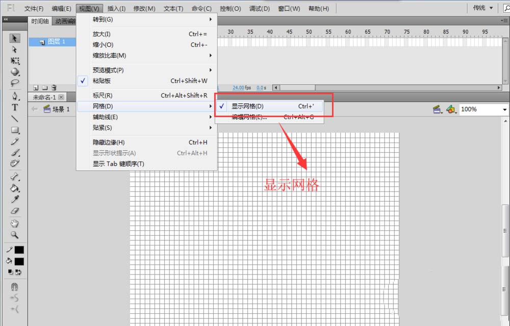2、找到視圖菜單欄,在視圖菜單中找到網格,在網格中找到“顯示網格”命令,勾選顯示網格,這樣flash舞臺上就出現了網格線。