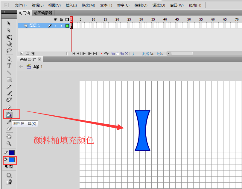 6、選擇顏料桶工具為矩形填充一個顏色,然后選擇線條工具繪制一個直線,并用選擇工具將其拉彎曲,在設置線條白色。這樣,一個凹透鏡圖形就做好了。