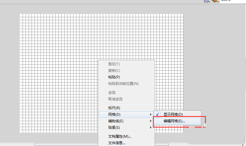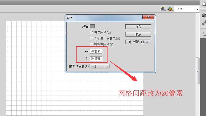 3、在flash網格線上右鍵鼠標,選擇編輯網格,然后在網格設置窗口中設置網格的水平與垂直間距都為20像素。