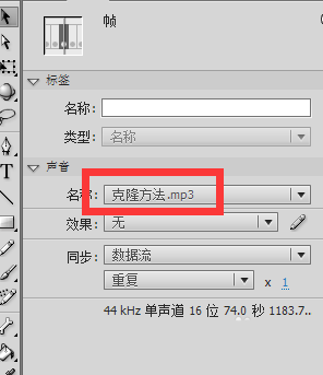 3、這時,我們選中時間軸上的聲音,在屬性面板上設置。