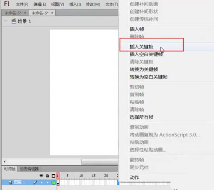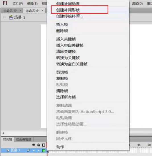 3、接下來在第一幀的地方右鍵單擊選擇創建補間形狀,如下圖所示