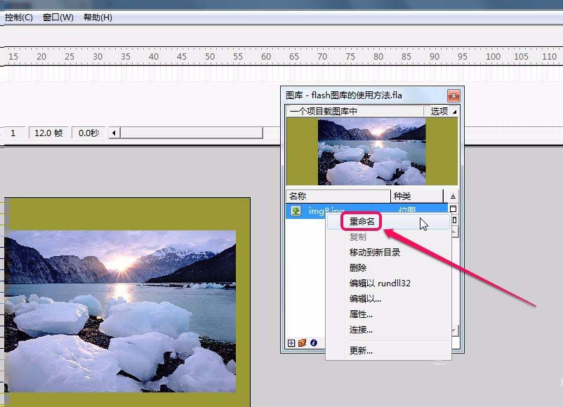 8、圖庫中的素材一般建議更改名稱,改成和動畫內容相關的名稱就可以,方便使用。在“圖庫”圖片名稱上面單擊鼠標右鍵,選擇菜單中的“重命名”,例如把名字修改成“風景”。