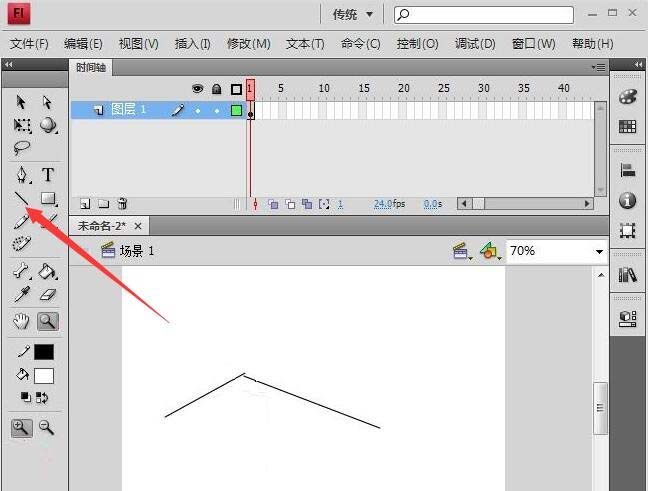 1、首先,打開Flash CS4,點擊直線工具,在工作區(qū)中畫出一條直線。