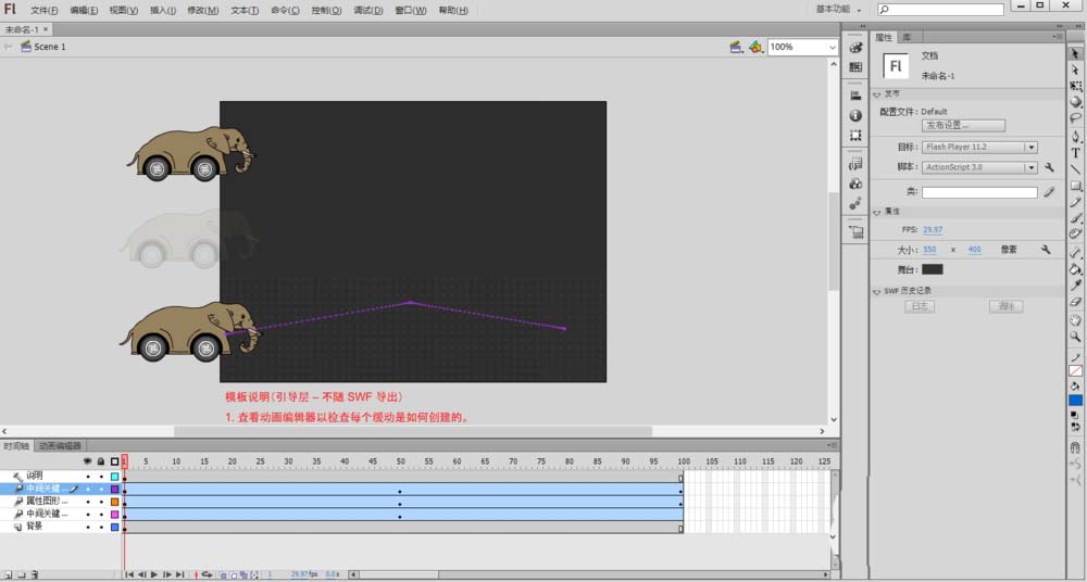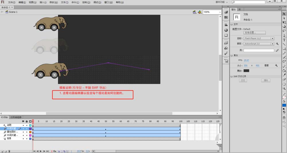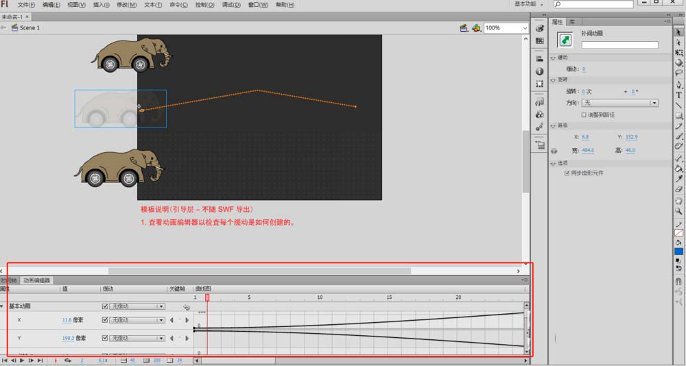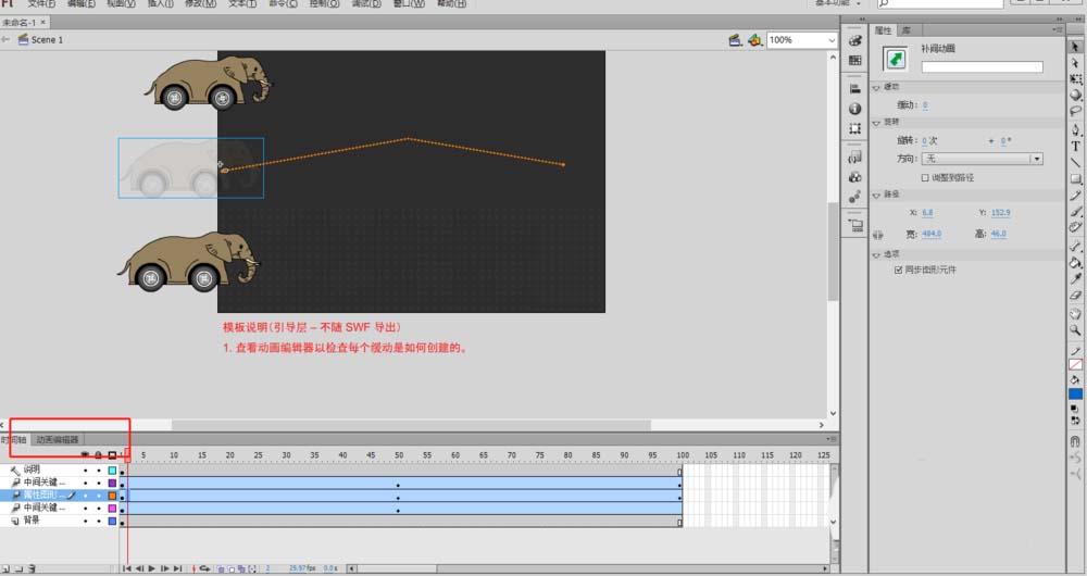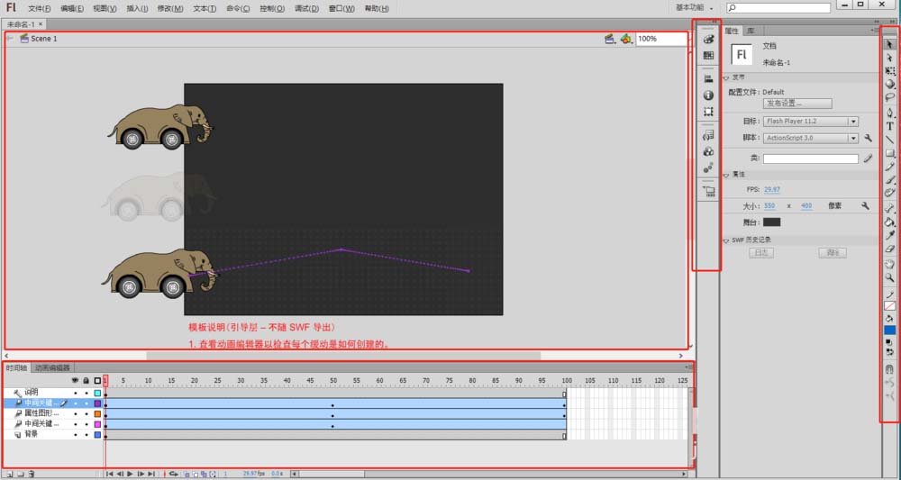 3、創(chuàng)建動畫成功后,熟悉Flash操作面板。一些工具的位置,資源的位置,時間軸,動畫編輯器等。