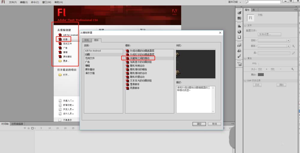 2、新建動畫,選擇從模板創(chuàng)建動畫,選擇關(guān)鍵幀之間的緩動。然后點擊確定創(chuàng)建動畫。