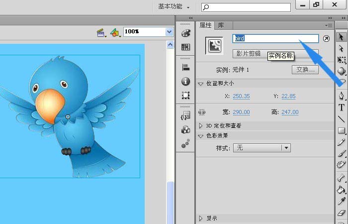 6、接著,在右邊的圖形屬性窗口上,在【實例名稱】處輸入圖形的名稱,如下圖所示。實例名稱在代碼中是變量名,需要先定義變量名,才可以代碼中引用,控制影片剪輯的實例。