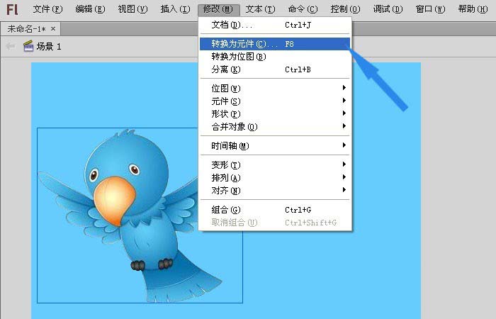 4、接著,鼠標左鍵選擇圖片,并單擊菜單中的【修改】>>【轉換為元件】,如下圖所示。