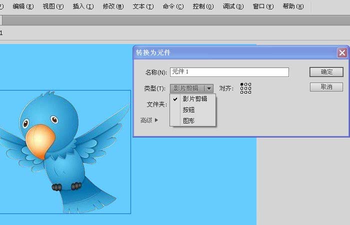 5、然后,在【轉換為元件】窗口上,鼠標左鍵選擇【影片剪輯】,并單擊【確定】按鈕,如下圖所示。