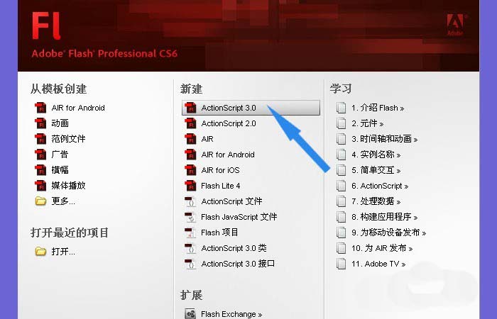 1、在計算機中,打開Flash軟件后,選擇【ActionScript3.0】,新建一個Flash的空白文件,如下圖所示。