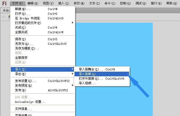 2、接著,準備對個素材圖形使用實例名稱,在新建文檔的窗口上,鼠標左鍵單擊菜單【文件】下的【導入】>>【導入到庫】,如下圖所示。
