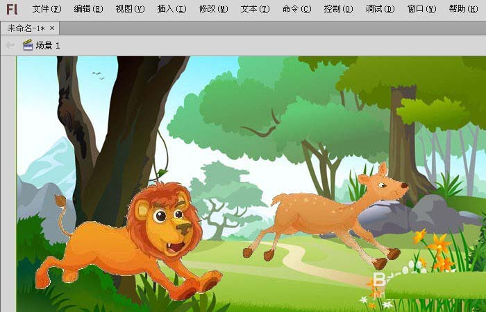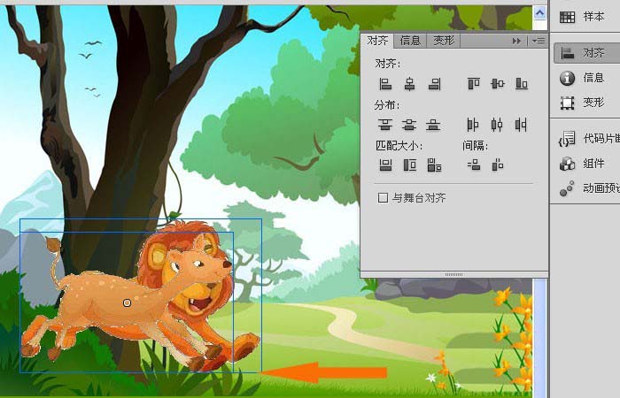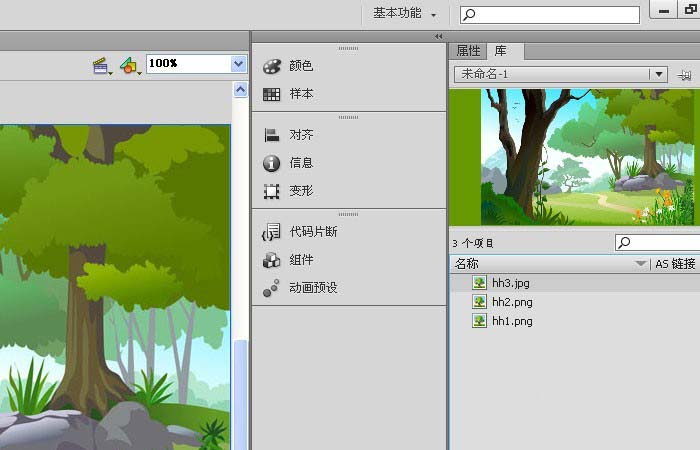 2、接著,導入素材圖片到庫,把庫中的素材圖片,通過鼠標的操作,拖放到畫布上,擺放好圖形的位置,比如卡通深林圖,作為背景圖,如下圖所示。