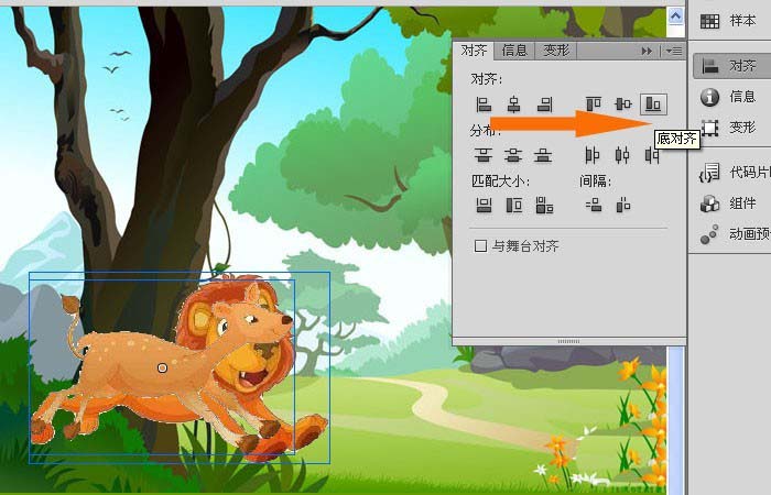 6、最后,可以看到畫布中的卡通動物圖形,底部的邊框對齊了,如下圖所示。在游戲測試中會經常使用對齊工具,來輔助對齊圖形,喜歡制作游戲和動畫的朋友們也來做做吧。
