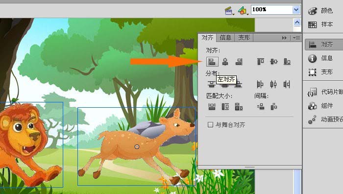 3、然后,庫中的素材圖片中,拖放兩個卡通動物圖形到畫布上,可以看到圖形,沒有對齊,如下圖所示。