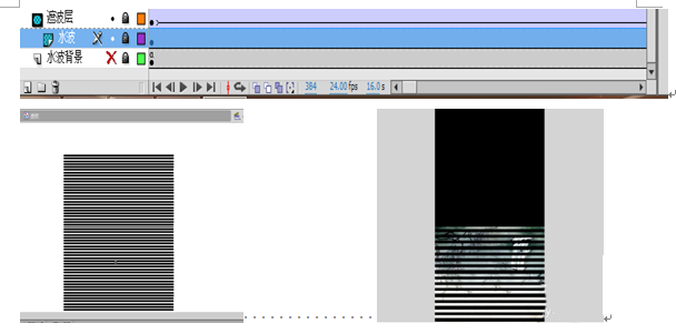 5、建立遮波層,新建圖形元件波紋,將其拖入到遮波層中,在第其676幀處,插入關鍵幀,在676幀將其進行位移,創建傳統補間動畫,再將其設置為水波層的遮罩層,具體如圖: