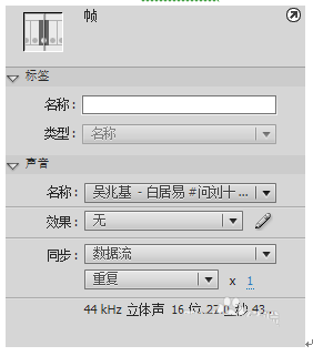 6、建立音樂圖層,其音樂拖到舞臺上,音樂圖層上的幀屬性,如圖: