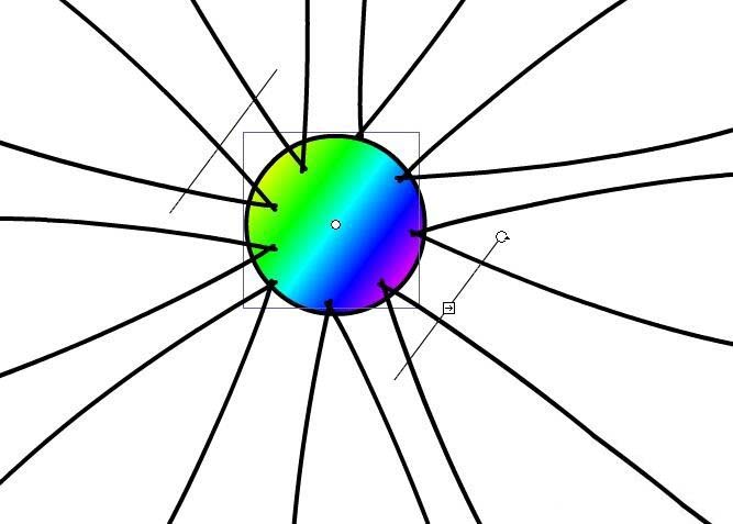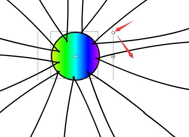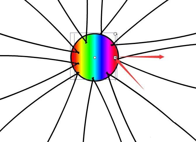 4、然后對著填充好色彩的位置點擊,出現(xiàn)一個方框形狀,對著方框右側(cè)一個帶箭頭的小白塊處按住往右側(cè)拉動,如圖箭頭所示。我們發(fā)現(xiàn),漸變色就會向左右兩邊擴展。