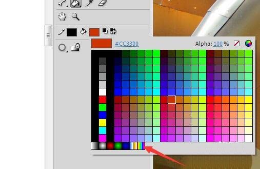 2、在工具欄的下方點擊顏色桶圖標右側(cè)的顏色處,彈出顏色選擇,點擊最底下的彩色漸變色。對著形狀中想要填充的位置點擊。