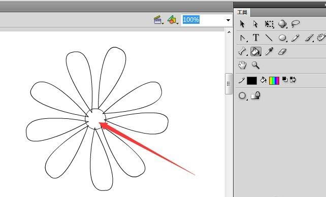 1、首先,打開Flash CS4,如圖先畫好要進行填充色彩的形狀。再點擊工具欄上的顏料桶工具。