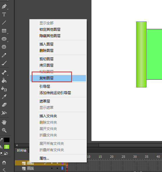 5、將圖層1重命名為畫面,新建一個圖層,命令為畫軸,然后用矩形工具在畫面的左側(cè)位置畫出一個矩形,選中這個矩形,打開顏色窗口,給這個矩形的填充顏色設(shè)置為線性漸變,給其設(shè)置一個漸變顏色,然后將這個圖層右鍵復(fù)制一個。
