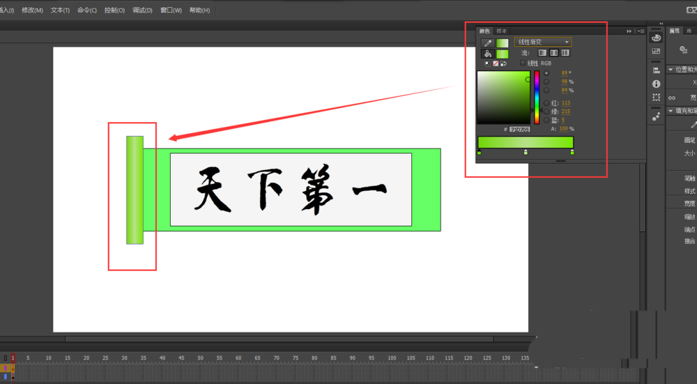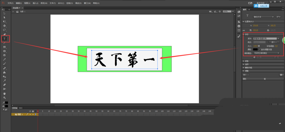 3、選擇文本工具,在灰白色的矩形中間輸入文字內(nèi)容“天下第一”,然后打開文字屬性窗口,設(shè)置文本的屬性,選擇一個字體,調(diào)整字體的大小等屬性。