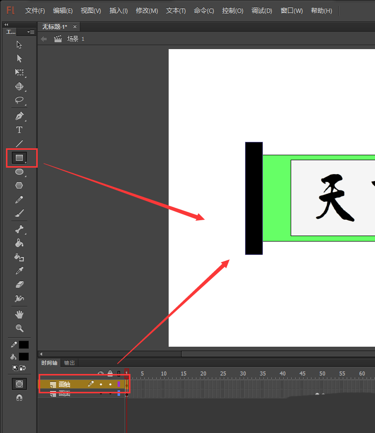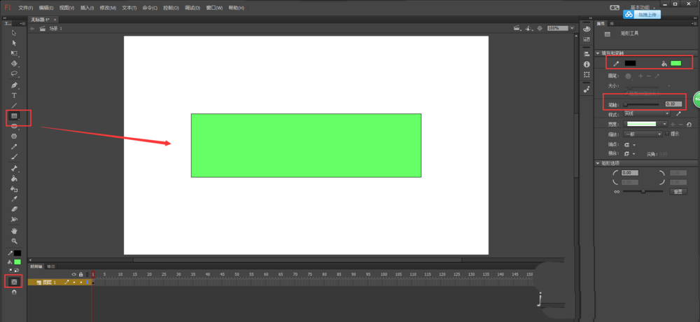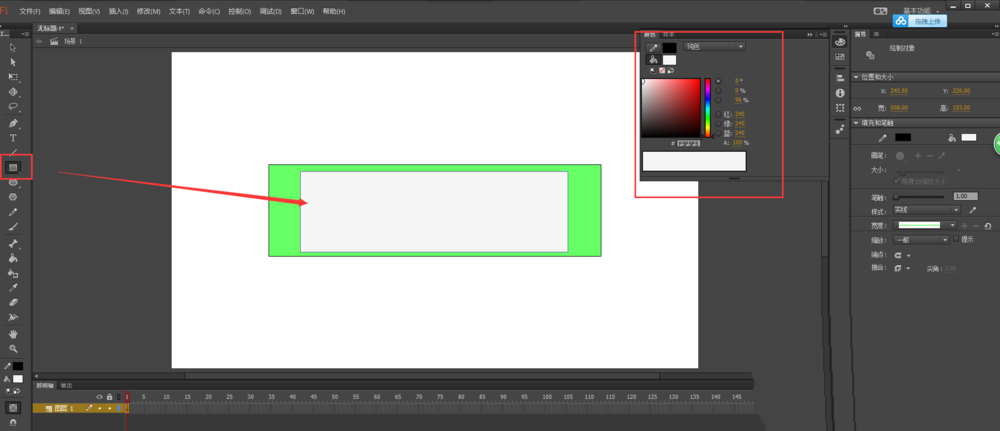 2、選擇flash工具欄中的矩形工具,設(shè)置筆觸顏色為黑色,填充顏色為一個綠色,將筆觸的大小設(shè)置為最小,勾選對象繪制,然后在畫布中間畫出一個大小差不多的矩形出來;然后再次用矩形工具在已經(jīng)繪制的矩形中間繪制一個比他小一點(diǎn)的矩形,并將這個小一點(diǎn)的矩形設(shè)置填充顏色為灰白色。