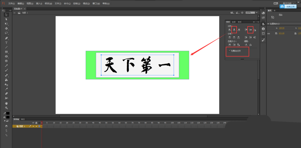 4、用選擇工具在畫布中間進(jìn)行框選,將兩個矩形與一個文本對象全部選中,然后打開對齊窗口,勾選與舞臺對齊命令,然后單擊水平中齊與垂直中齊。