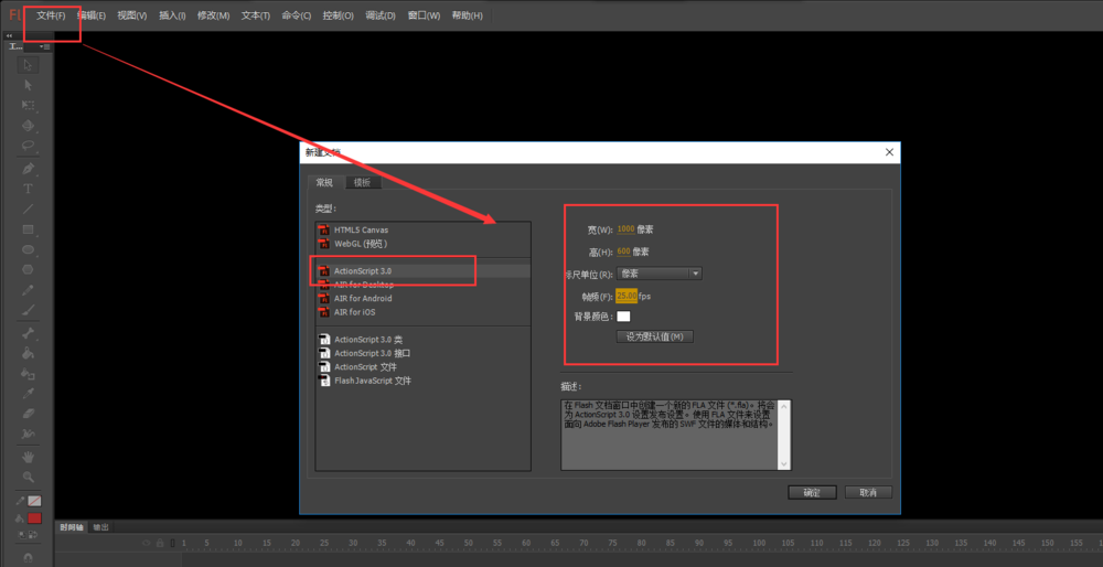 1、找到電腦桌面上的flash軟件的快捷圖標(biāo),鼠標(biāo)左鍵雙擊flash的快捷圖標(biāo),打開flash這個軟件,然后在文件中找到新建,新建一個大小為1000*600像素,幀頻為25,背景顏色為白色的動畫項(xiàng)目。