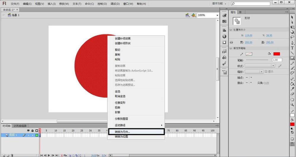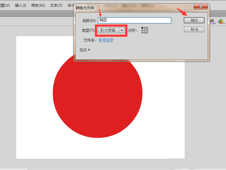 5、編輯,按住鍵盤ctrl,拖動(dòng)鼠標(biāo),繪制一個(gè)正圓。選中圓形,右鍵單擊鼠標(biāo),選擇轉(zhuǎn)化為元件。窗口彈出后,名稱改為橢圓,也可隨意改;類型選擇影片剪輯,然后點(diǎn)擊確定。
