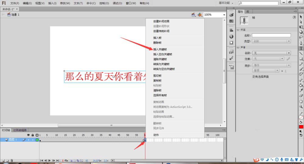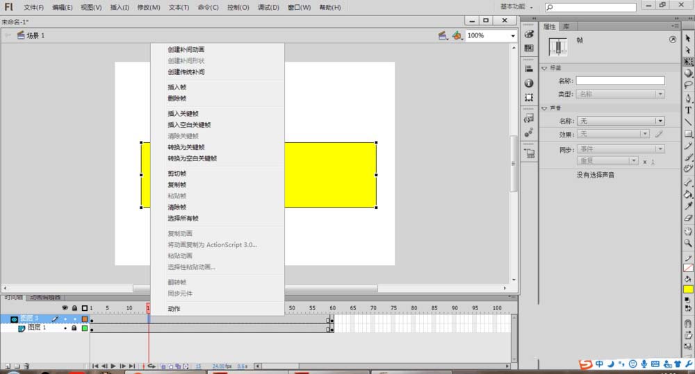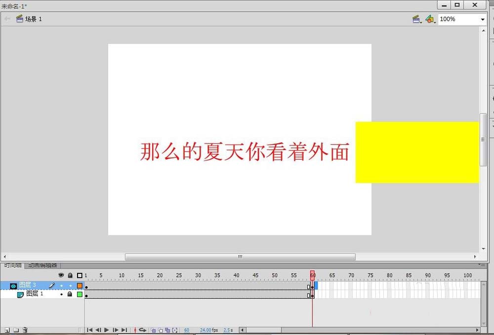 7、動畫。在圖層2第一幀,矩形覆蓋文字,然后在第60幀的位置插入關鍵幀,把矩形移開。在圖層2的1-60幀位置,右擊創建傳統補間。