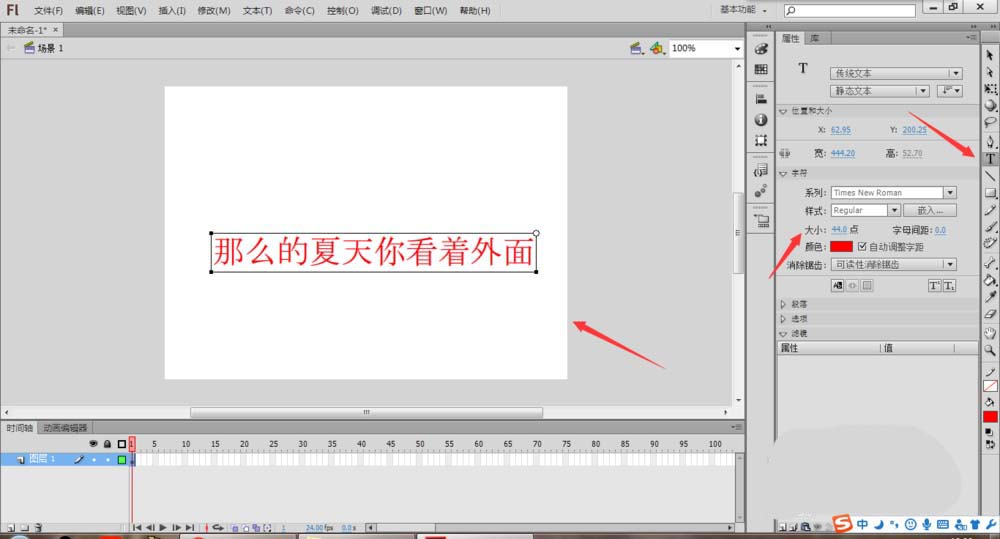 3、文本工具。使用文本工具,在舞臺上的合適位置添加文字,然后更改文字的類型、大小和顏色等。