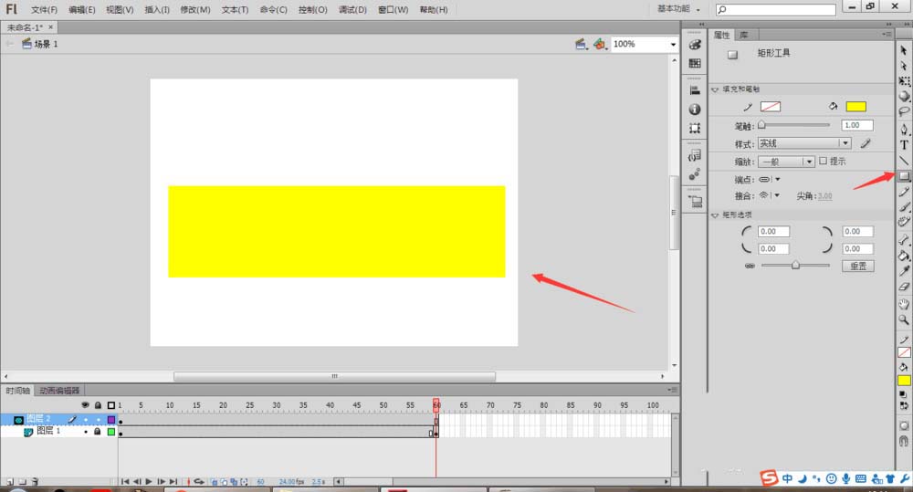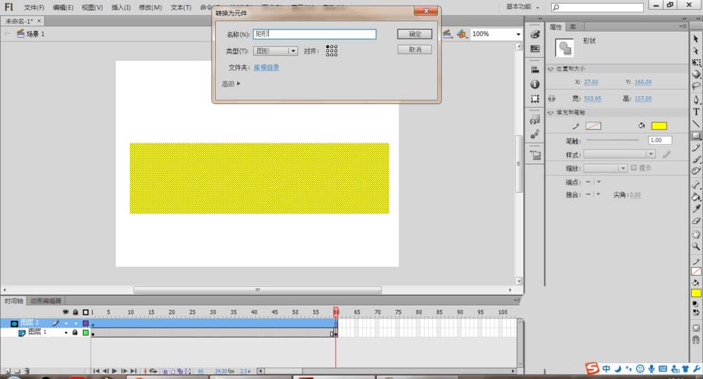 6、制作。在圖層2,選擇矩形工具繪制一個覆蓋文字的矩形大小。然后選中圖像后將它轉化為圖形元件。名稱為矩形,類型為圖形