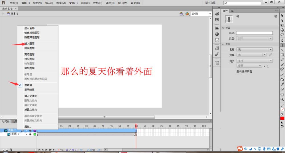 5、插入關鍵幀,新建圖層。在圖層一中,右鍵單擊第60幀,選擇插入關鍵幀。然后點擊圖層1,選擇插入圖層,再右擊選擇遮罩層,將圖層2轉化為遮罩層。