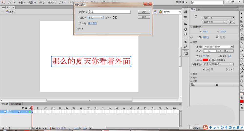 4、將文字轉化成元件。選中文字,然后右擊,選擇轉化為元件,元件名稱為歌詞,元件類型為圖形,然后點擊確定按鈕即可。