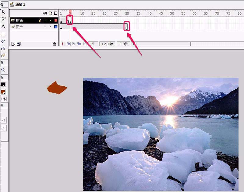 7、在“圖片”圖層第30幀插入普通幀;在“擦除”圖層第5幀插入關鍵幀。