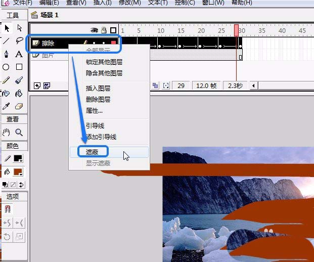 11、在“擦除”圖層上面單擊鼠標右鍵,選擇菜單中的“遮蔽”命令。