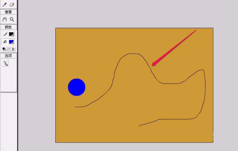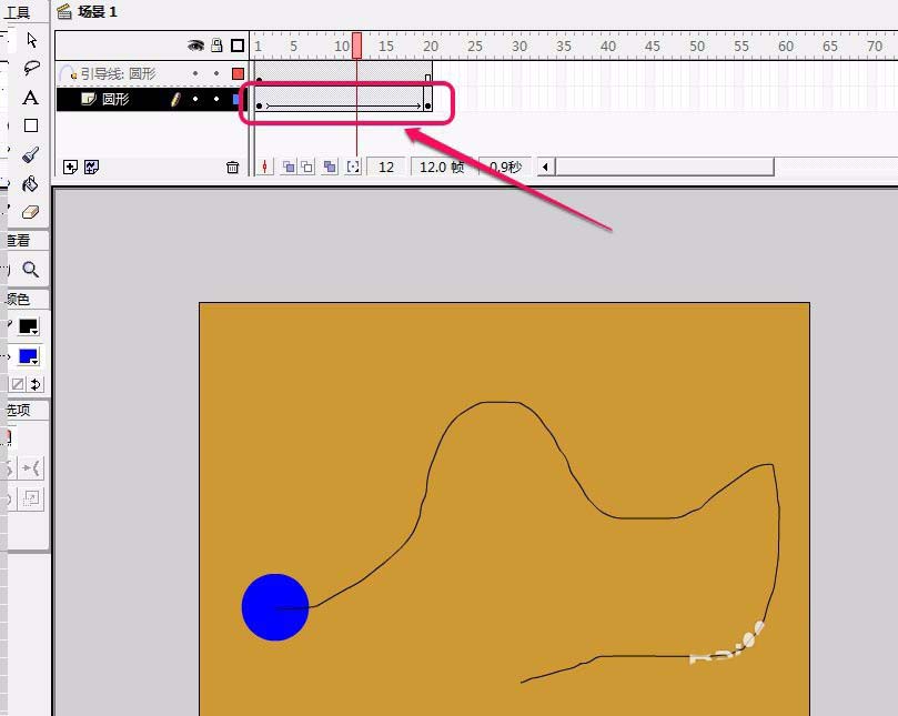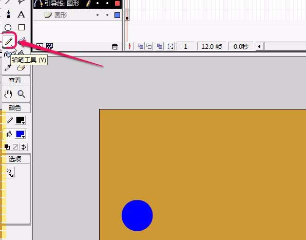6、保持“引導線:圓形”圖層為被選中狀態,在舞臺上用鉛筆工具繪制一條曲線。