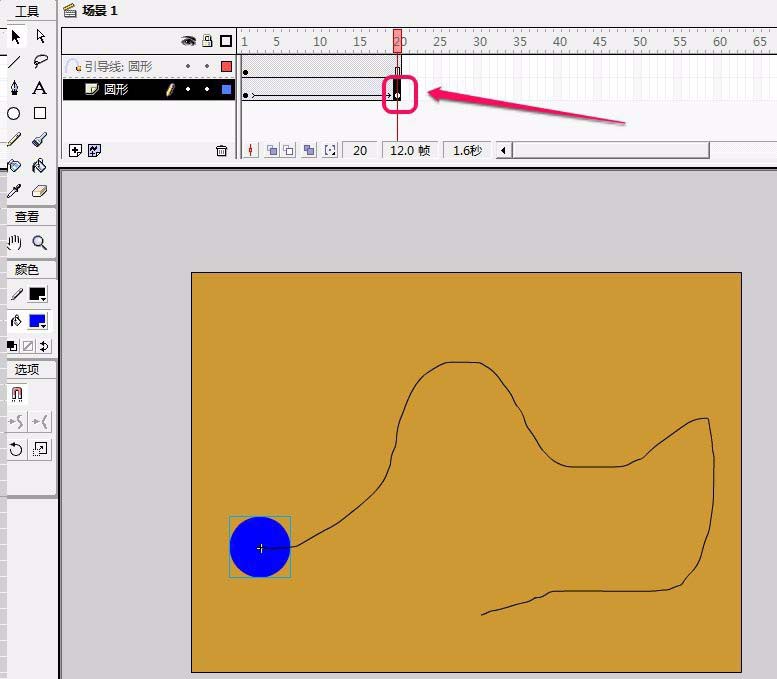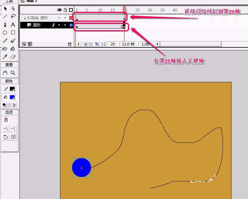 8、將“引導線:圓形”圖層幀數延續到第20幀。在“圓形”圖層第20幀插入關鍵幀。
