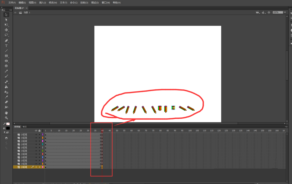 2、將我們之前的鉛筆人元件直接拖入到場景畫布中。然后選擇任意變形工具,將鉛筆人縮放到合適大小。