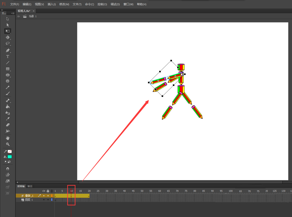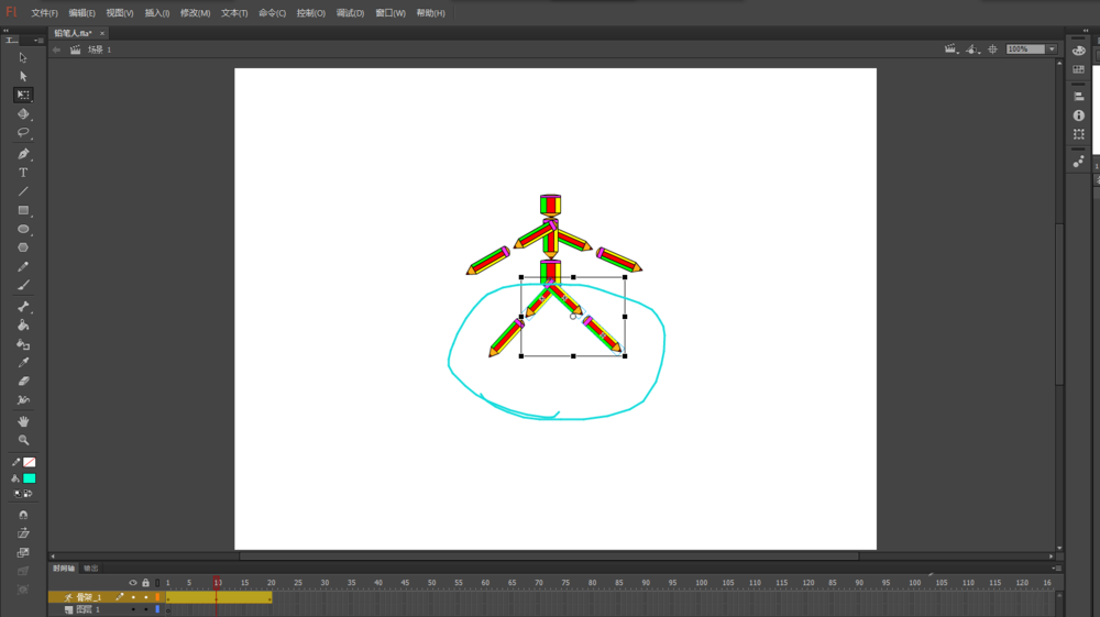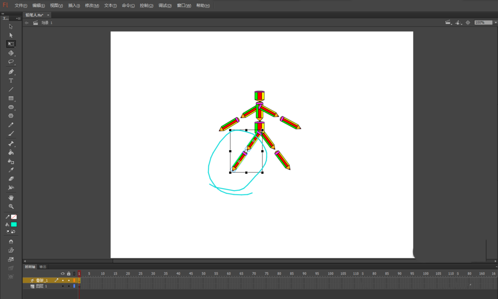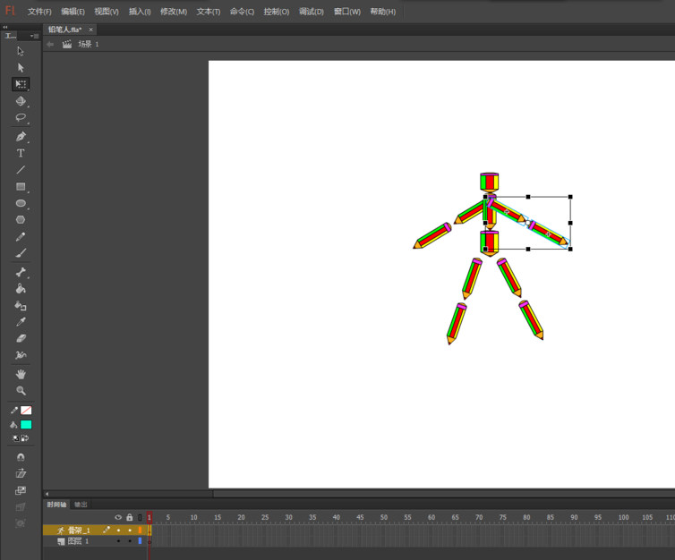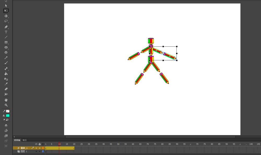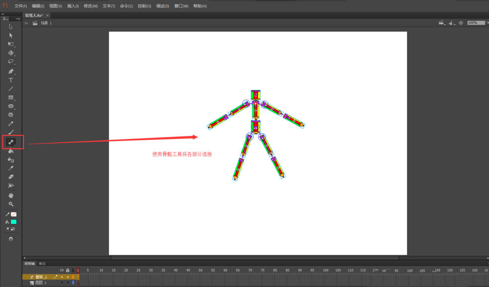 1、打開flash軟件,直接畫一個鉛筆人鉛筆人;然后選擇工具欄中骨骼工具,將鉛筆人的各個部分進行骨骼連接。