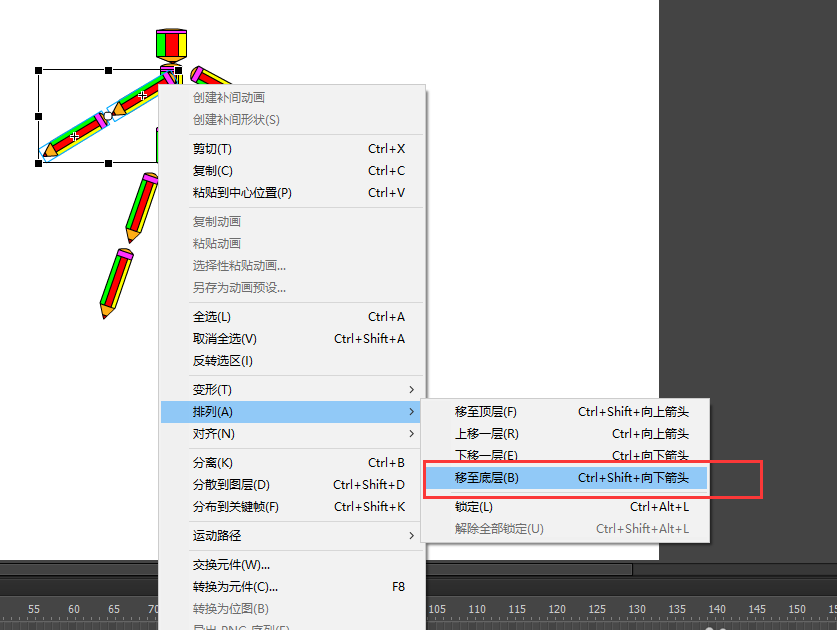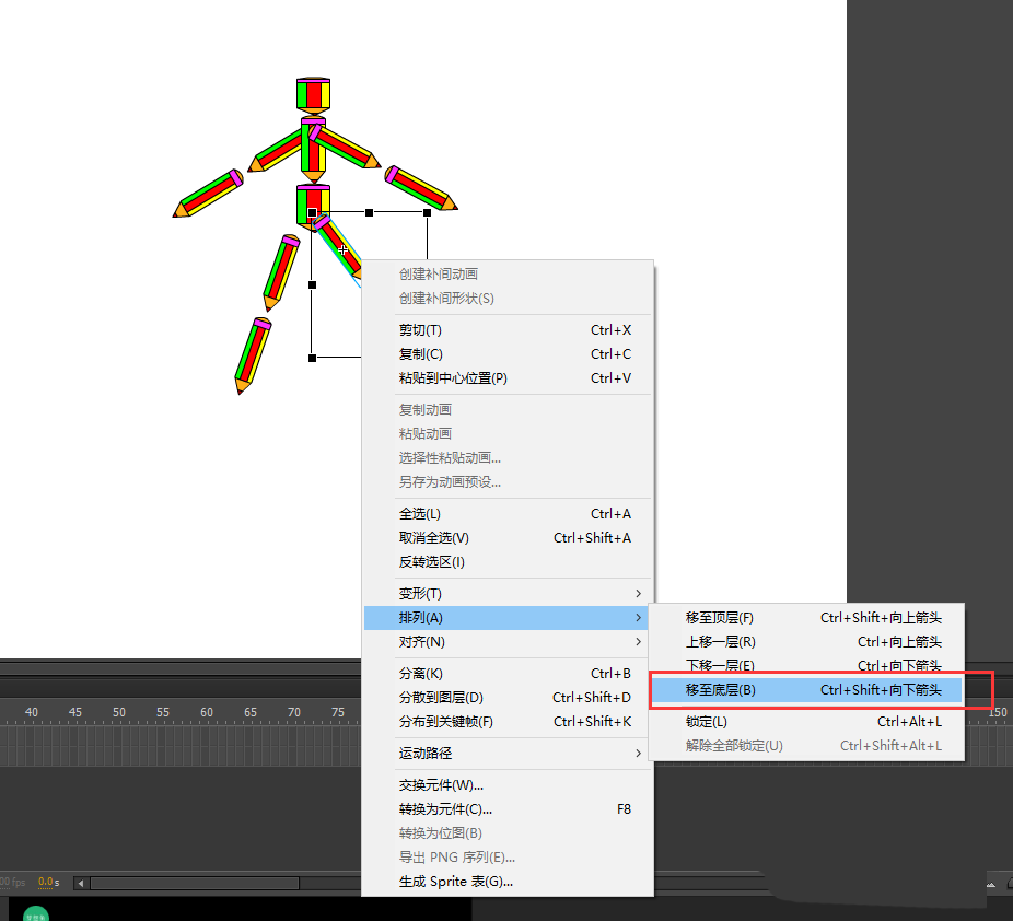 2、用任意變形工具選中鉛筆人做的胳膊,然后有右鍵鼠標將其移至底層;在選中右側的胳膊,移動并調整其位置置于頂層。