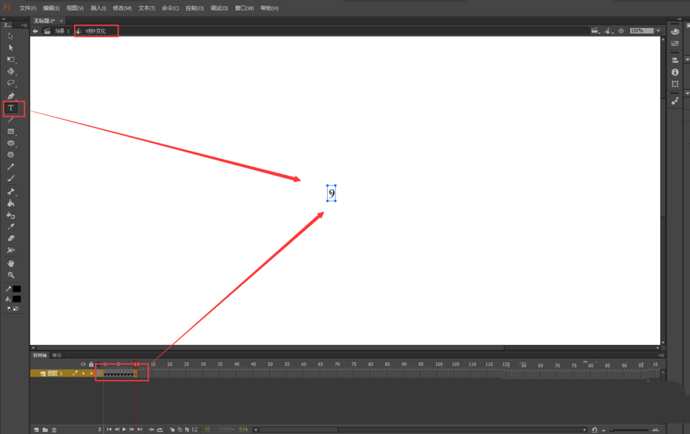 3、進入到“0到9變化”這個圖形元件中進行編輯,在時間軸第一幀的位置用文字工具輸入數字0,然后在下一幀插入一個關鍵幀,將文字內容改為1,依次類推,一直共創建了連續的10個關鍵幀,包含了數字0到9.
