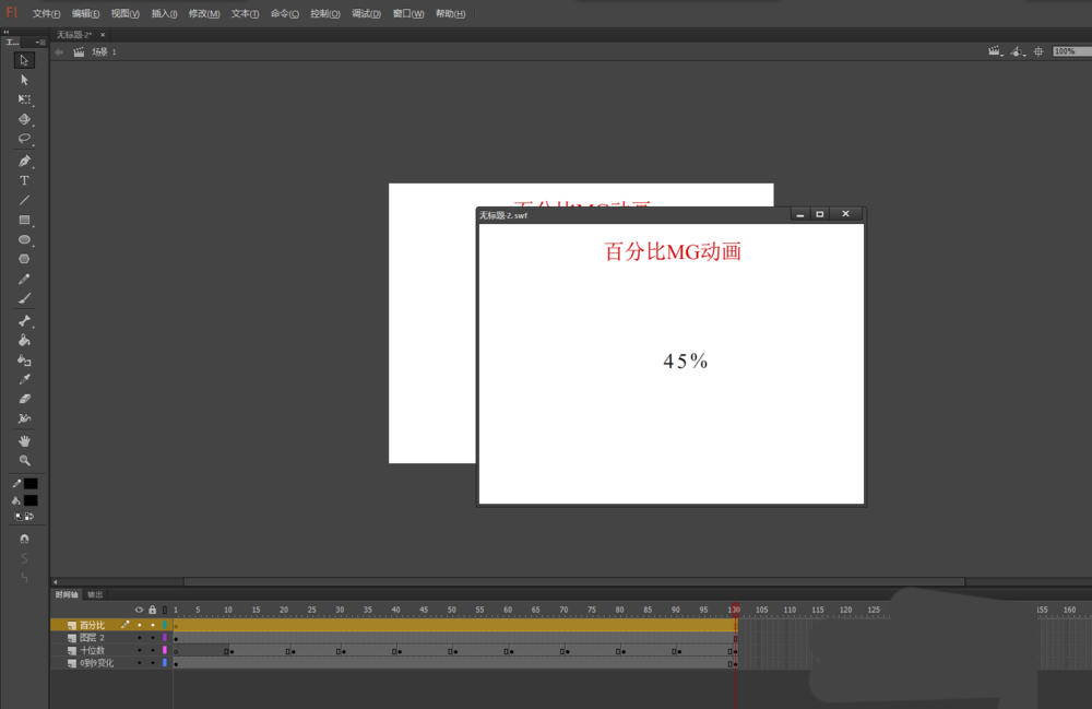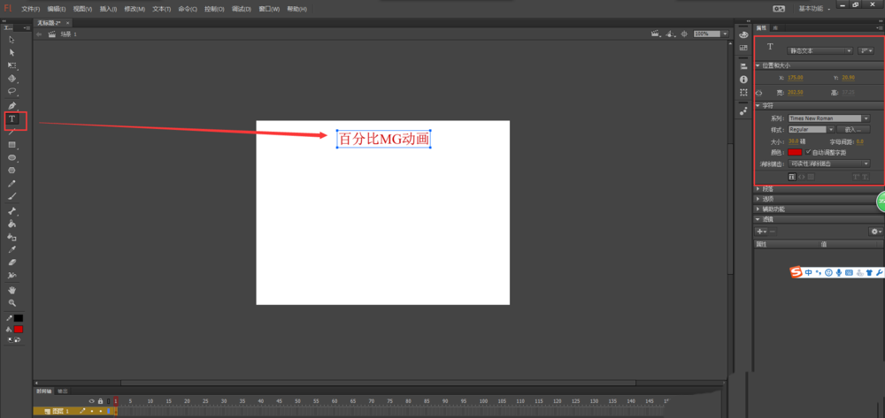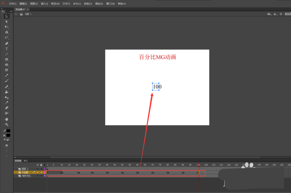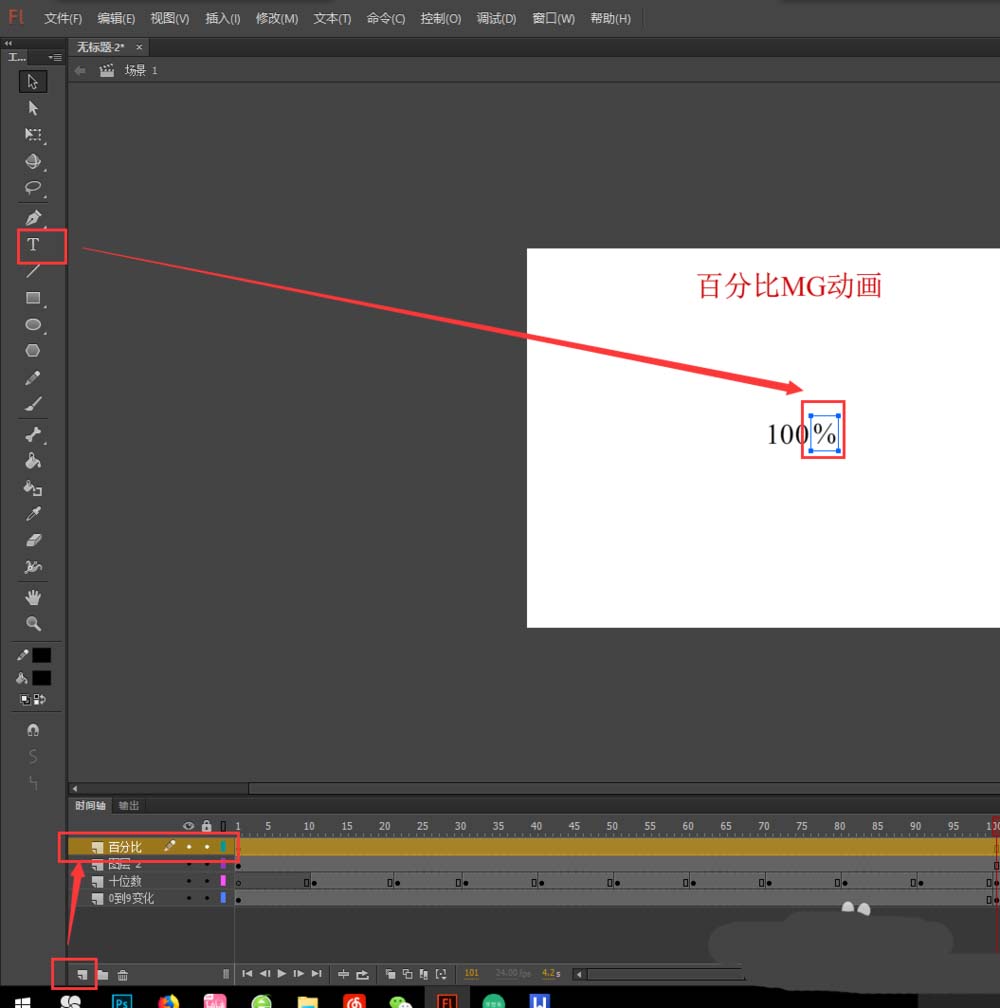 1、打開flash軟件,新建一個flash項目,用文字工具在畫布上方寫上“百分比MG動畫”。